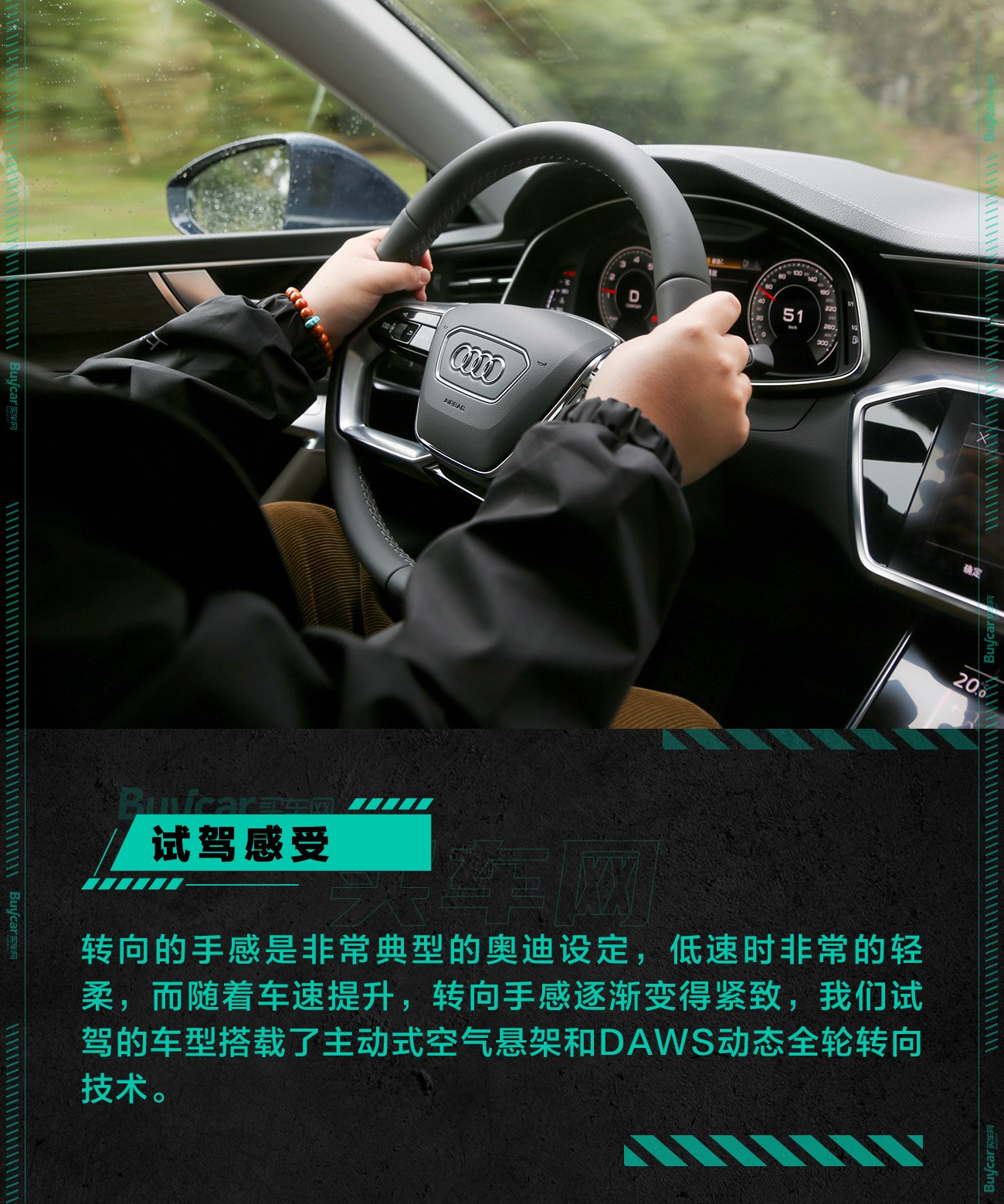 A7L是奥迪在国内首次搭载DAWS动态全轮转向技术车型,60公里/小时以下车速,当车辆转向,后轮会跟随前轮形成反向,从而减少转弯直径,对于车长超过5米的“大家伙”来说,这项技术能够帮助A7L在低速掉头、高速变道更加从容。