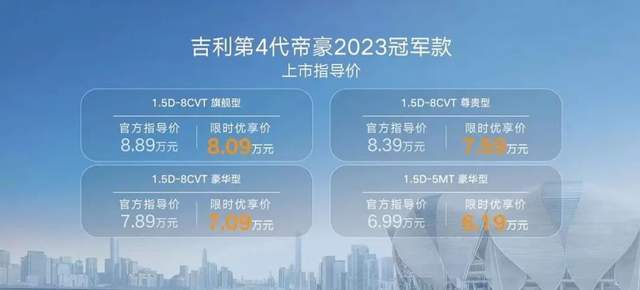 号称“国民冠军家轿”的吉利第4代帝豪冠军版正式上市,在第4代帝豪的基础上加量不加价,限时优惠价格为6.19-8.09万元。