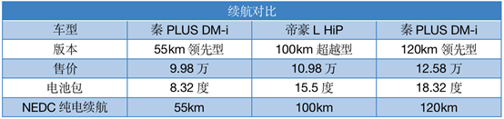 一提到秦PLUS冠军版我们就会说998,但实际上,9.98万的版本电池只有8.32度(磷酸铁锂刀片电池),NEDC纯电续航也只有55km,不是很够用,真正要家用的最好的买18.32度/120km的版本,但售价也要12.58万起了。也即是说998是起“引流”作用的,你最终掏钱很可能是花了1258。