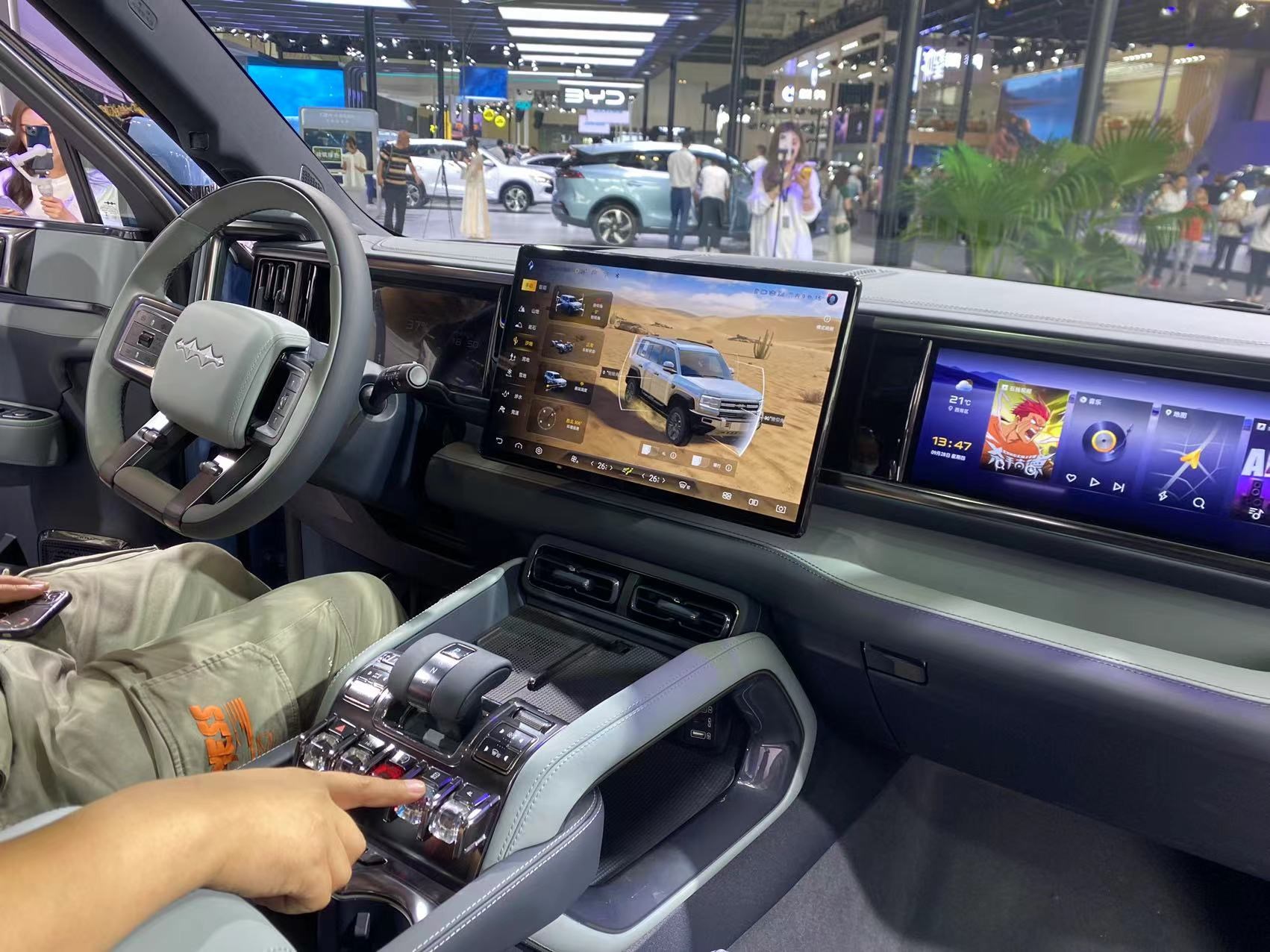 进入到车内,相比于外观的粗旷,新车内饰则十分细腻,中控台部分共搭载了三块屏幕,其中包括15.6英寸中控屏、12.3英寸仪表屏和12.3英寸副驾屏,营造出不错的科技氛围。