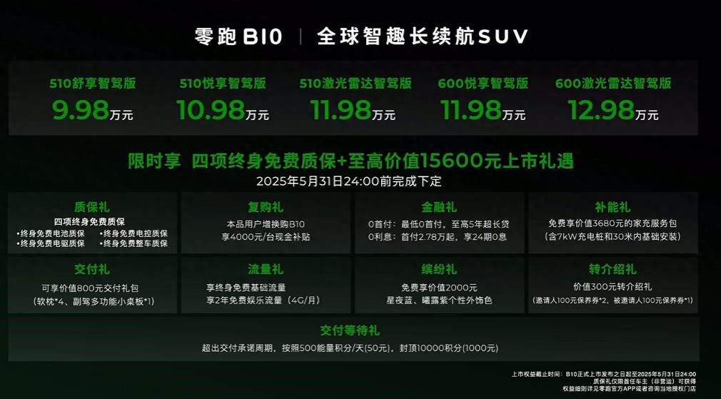 4月10日,零跑旗下的纯电紧凑型SUV——零跑B10正式上市。新车一共5个版本,纯电续航分为510km和600km两种,其中续航510km版本3款,600km版本共2款车型;价格区间从9.98万到12.98万元。