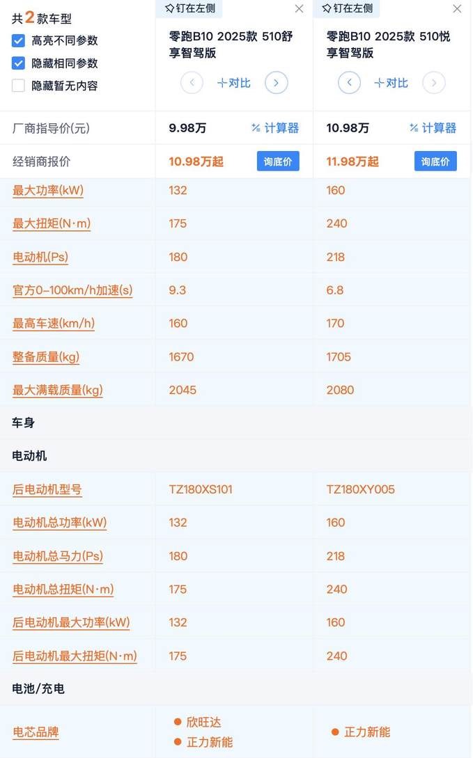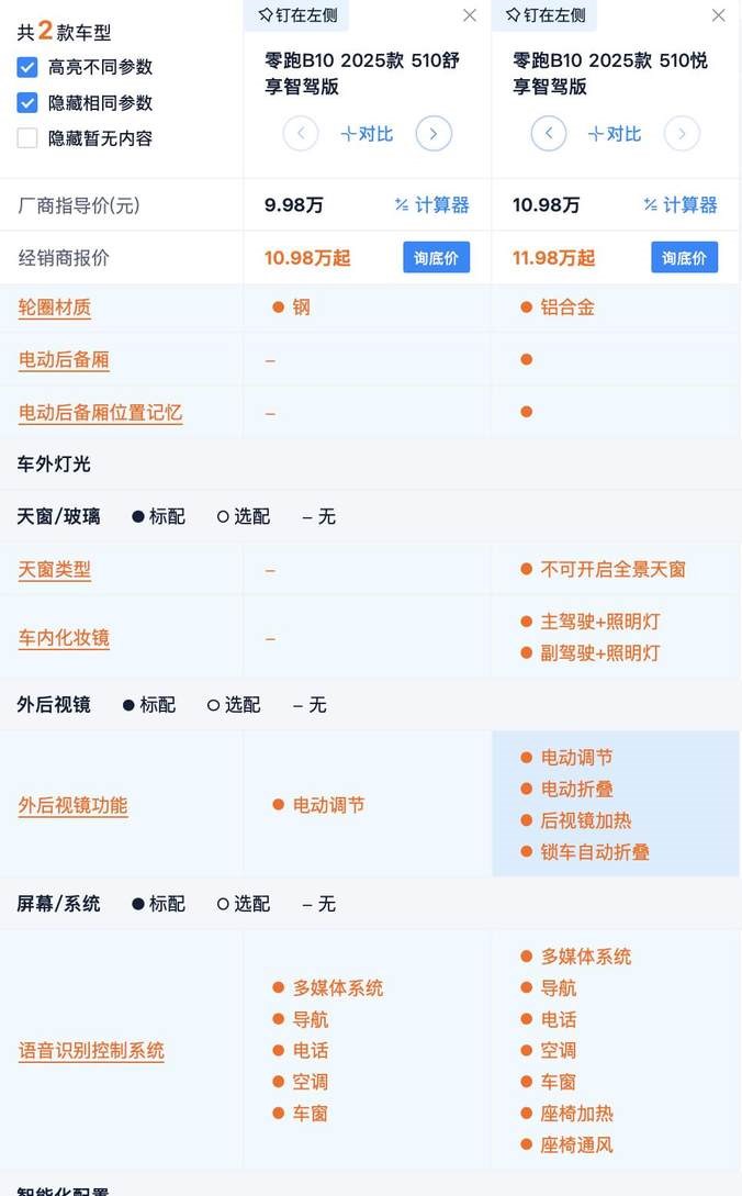 其实仔细看零跑B10的配置就会发现,510km入门版是配置在全系没有重叠,这就意味着它不仅拉低了全系的价格,更是为预算不太充裕的消费者提供了选择。如果不是选择这个版本的话,其实其他版本的需求点还是非常明显的。但个人认为510km和600km续航的差别并不大,所以这样看来,510km续航版本的性价比稍高一些。