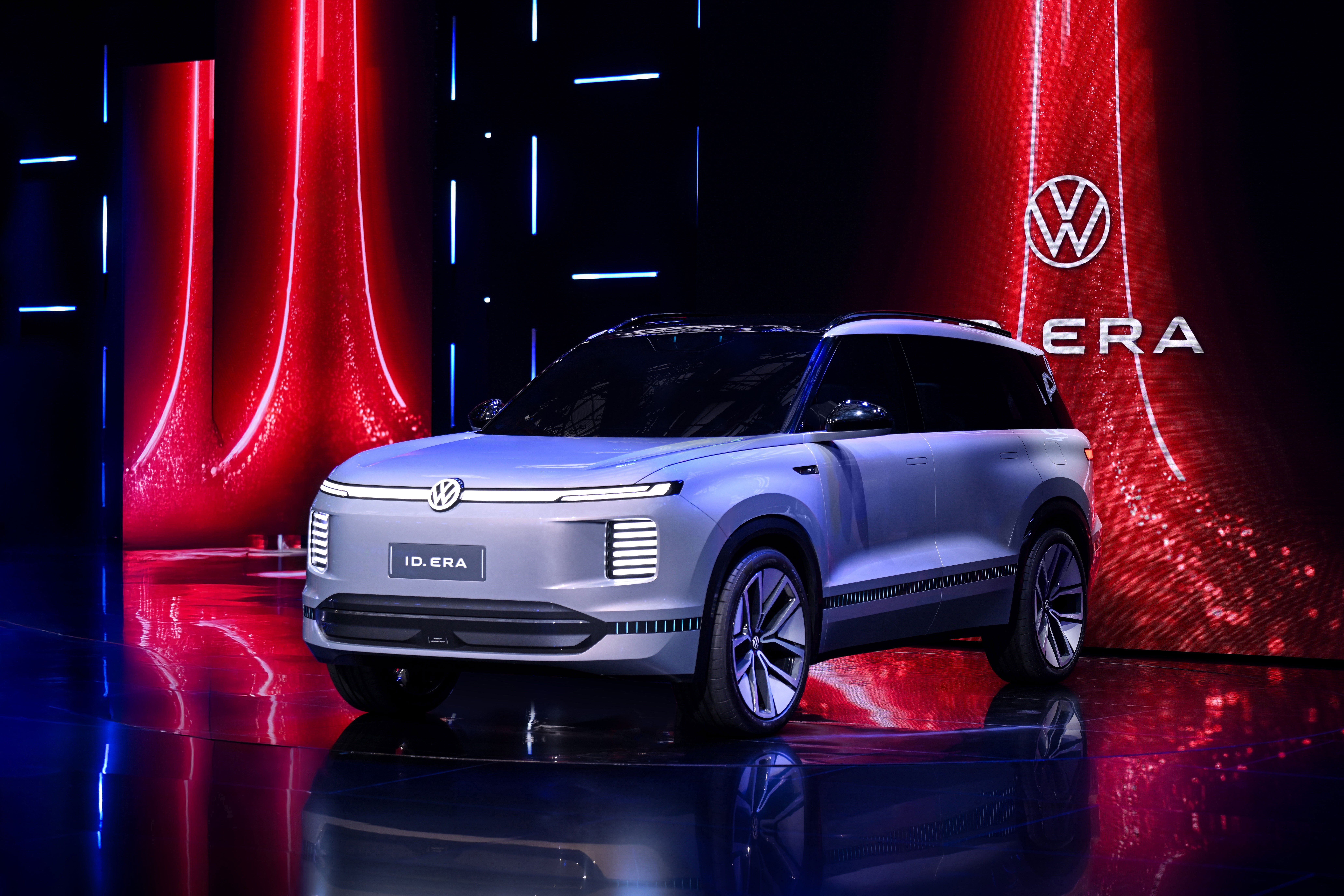 上汽大众展台中,一款魁梧、充满力量感的概念车位居C位,它的名字叫做ID.ERA,是大众品牌首款增程全尺寸SUV,“ERA”意为“时代”,你可以理解为:ID.ERA概念车是上汽大众面向新合资时代的排头兵。