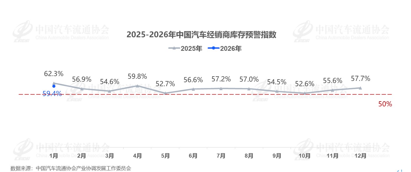 库存高企、需求平淡、政策调整效应待释放……2026 年 1 月中国汽车市场在多重因素交织下开局承压。根据中国汽车流通协会发布的数据显示,2026年1月中国汽车经销商库存预警指数为59.4%,同比下降2.9%,环比上升1.7%。