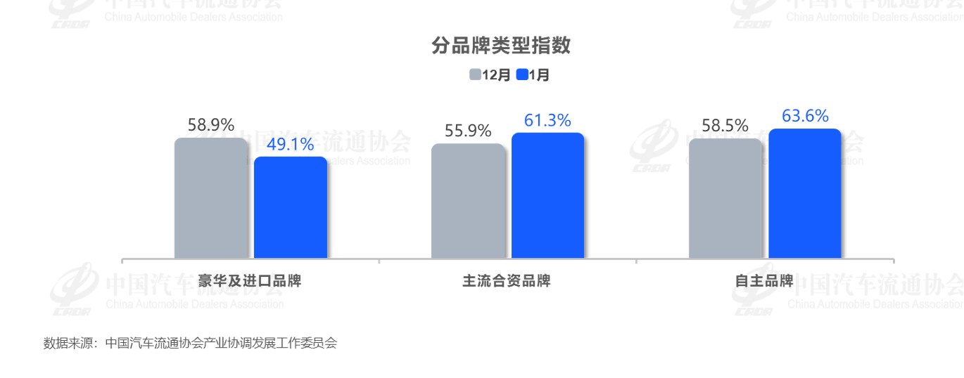 从区域市场来看,1 月南区库存预警指数高达 66.1%,成为库存压力最大的区域,各区域市场受消费习惯、政策落地进度等因素影响,表现呈现明显分化。品牌层面,豪华及进口品牌表现相对稳健,1 月库存预警指数为 49.1%,低于荣枯线;而主流合资品牌和自主品牌压力较大,指数均在60%以上,且环比呈上升态势。