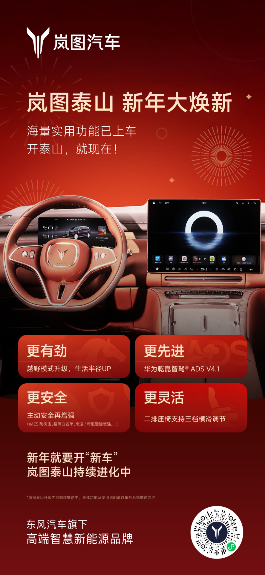 作为首批全量推送华为乾崑智驾ADS 4.1的车型,岚图泰山直接把华系高端车型的辅助驾驶拉到新高度——“别人有的我都有,别人强的我更强”!背靠华为顶级智驾技术,岚图泰山以全场景适配性与主动安全优势实现全维领先,树立高端商务SUV新标杆。