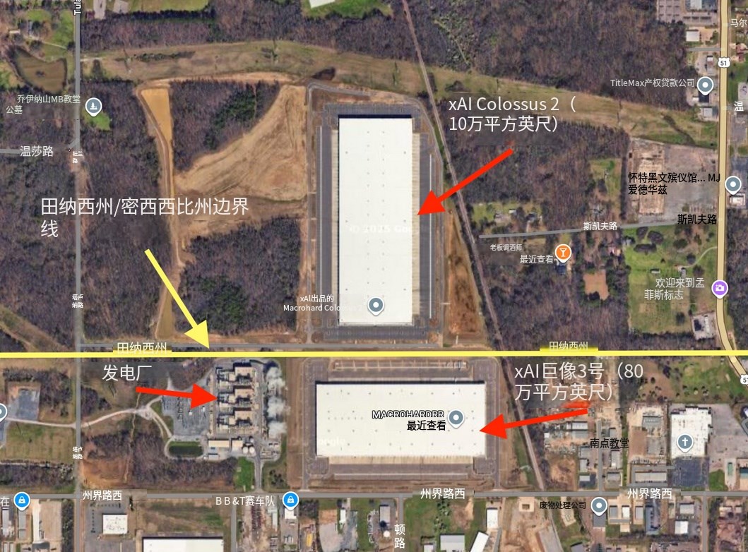 [xAI 的新 Colossus 3 大楼与 Colossus 1 和 2 结合,xAI 的总数据中心占地面积估计约为 250 万平方英尺。这三个站点将共同形成一个近 2GW 的超级计算机,配备超过 100 万个 GPU,总成本可能超过 350 亿美元。]