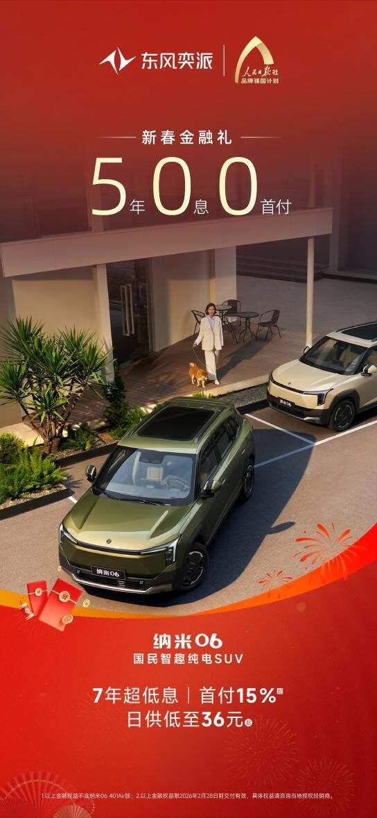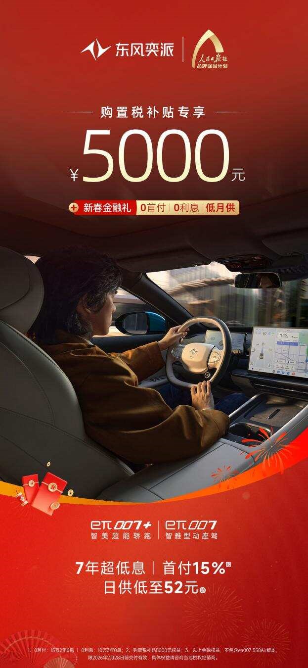 好车不等人,福利限时享!从产品到服务,从权益到体验,东风奕派始终坚持以用户为中心,回馈每一份信赖与选择。开年购车正当时,除以上车型,“大美智能国民车”纳米01也携4000元购置税补贴、5年0首付0利息的新春金融礼等权益而来,为消费者带来更丰富的出行体验。东风奕派这份“开年大礼”多重权益不断加码,此时入手新车正是最佳时机!别再犹豫,诚邀广大消费者莅临东风奕派授权门店试驾品鉴,把心仪爱车带回家,与家人朋友开启不“奕”样的美好新年旅程。