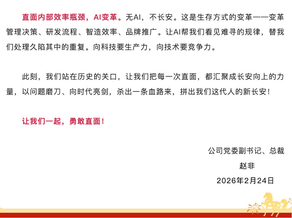 长安赵非则直接喊出:“直面内部效率瓶颈,AI变革。无AI,不长安。”