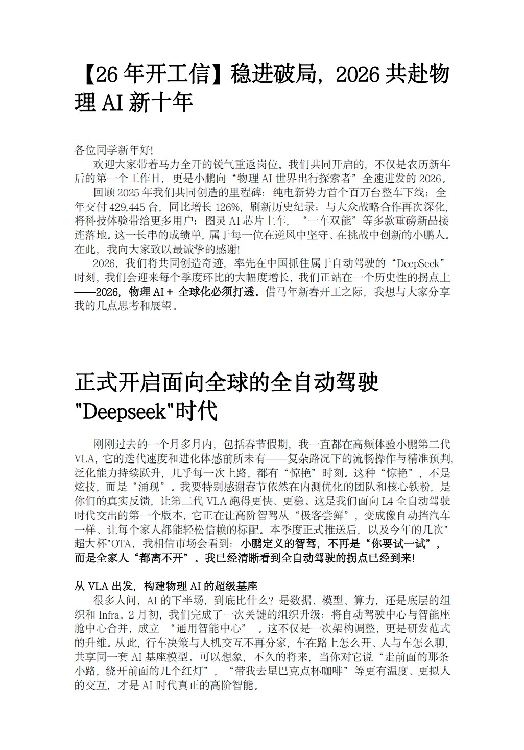 吉利汽车集团CEO淦家阅以“创业者”的姿态,在集团创业40周年之际写下“韧稳行远、聚力向前”的寄语;长安汽车总裁赵非发出了“杀出一条血路”的开工喊话;小鹏汽车董事长何小鹏则宣告2026年将是“物理AI+全球化必须打透”的拐点之年。