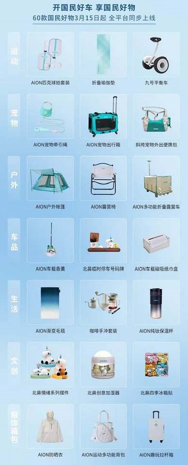首批发布的60多款“国民好物”涵盖户外露营、萌宠潮玩、养生疗愈等多元品类,广泛覆盖用户用车生活的各类场景,并将于3月15日起在埃安APP、京东等平台同步上线。
