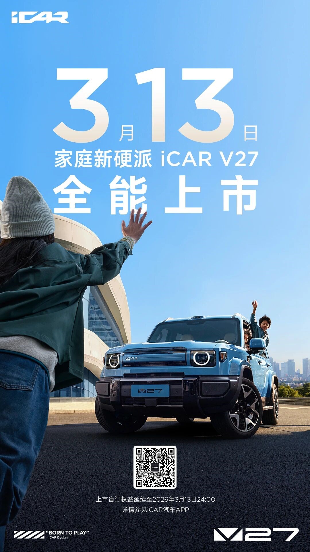 买车网Buycar获悉,在今日举行的 iCAR V27 技术发布会上,iCAR 品牌事业部总经理苏峻正式宣布,旗下“家庭新硬派”SUV iCAR V27 将于3月13日正式上市。新车将推出3款配置车型,并全系标配高通8295P 智能座舱芯片。