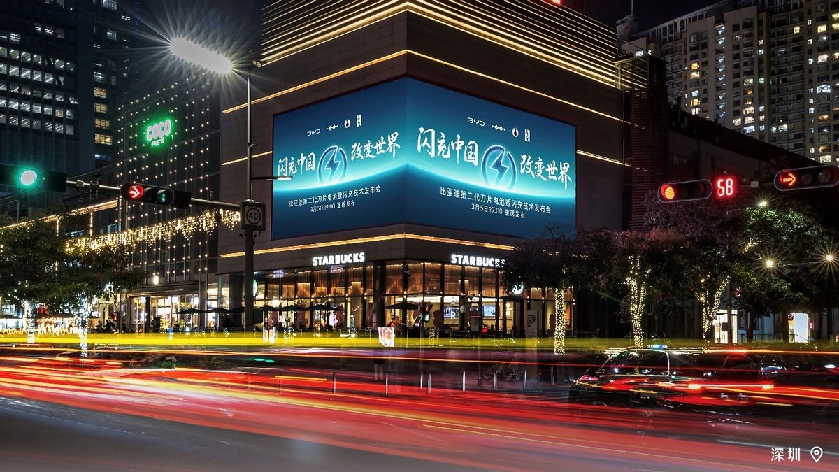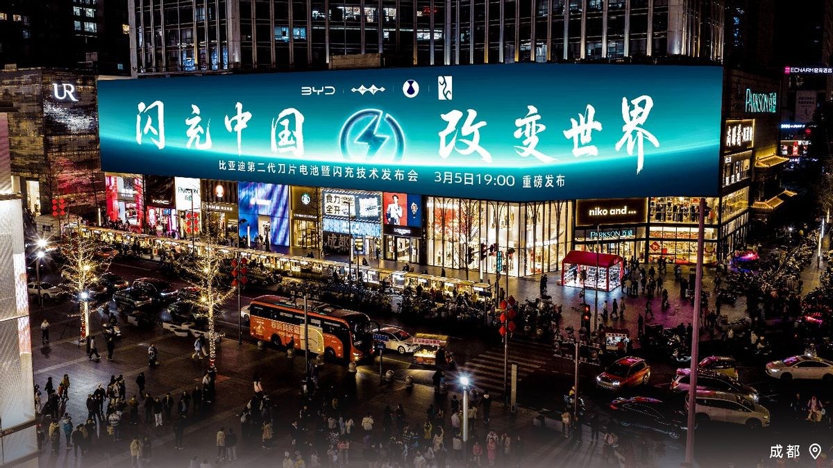 3月4日,比亚迪在北京、成都、广州、深圳等十余座城市的核心地段同步点亮“闪充中国 改变世界”主题广告,为3月5日19时举行的第二代刀片电池暨闪充技术发布会高调预热。