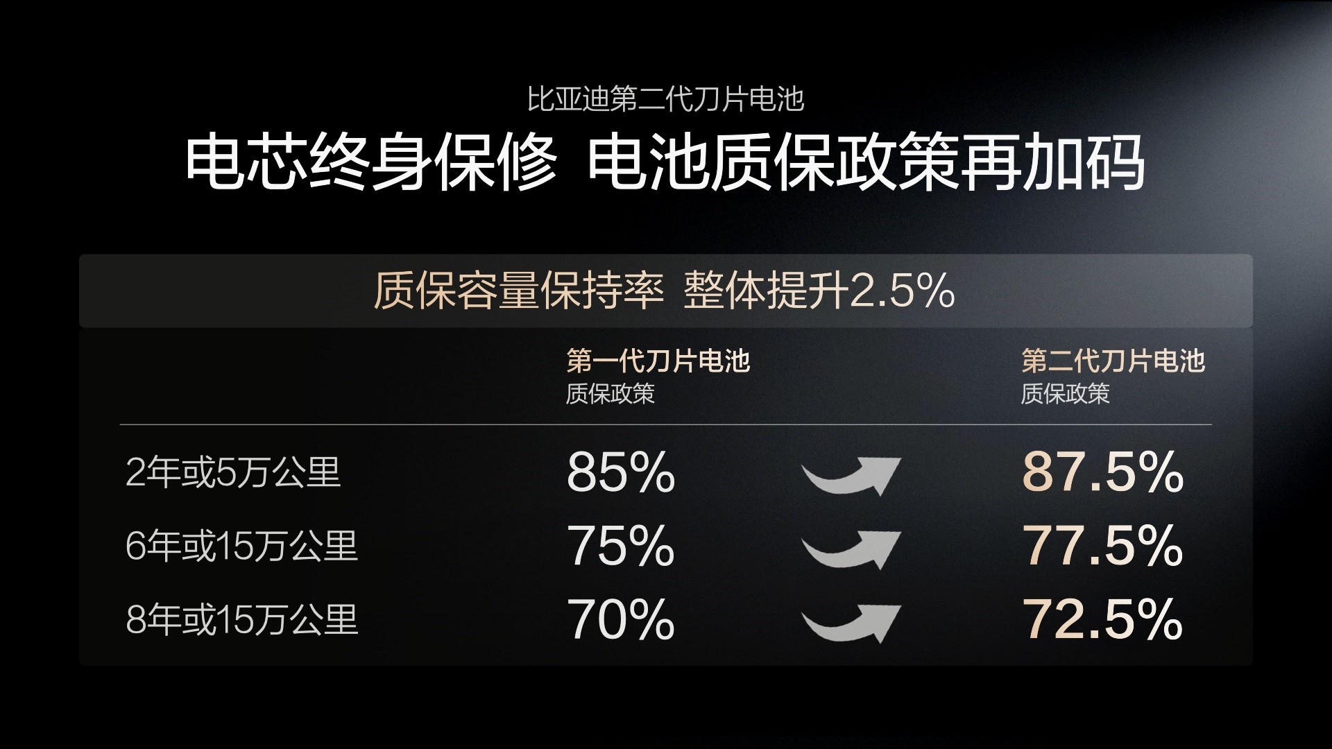 技术层面,第二代刀片电池通过构建锂离子高速通道,搭配全温域智能热管理系统,在快充过程中实现更低产热与更均匀高效的散热,减少快充对电池寿命的影响。安全方面,电池通过多项超越新国标的安全测试,保障使用安全性;质保政策同步优化,电芯依旧实行终身保修,电池容量保持率整体提升2.5%。