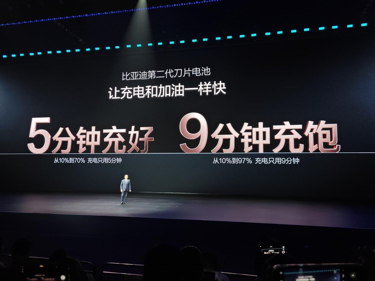 但一个月后的深圳大运中心体育馆,伴随着第二代刀片电池与1500kW闪充桩的发布,王传福念出了一串足以载入新能源史册的数字:充电从10%到70%,只需5分钟;从10%到97%,只需9分钟。