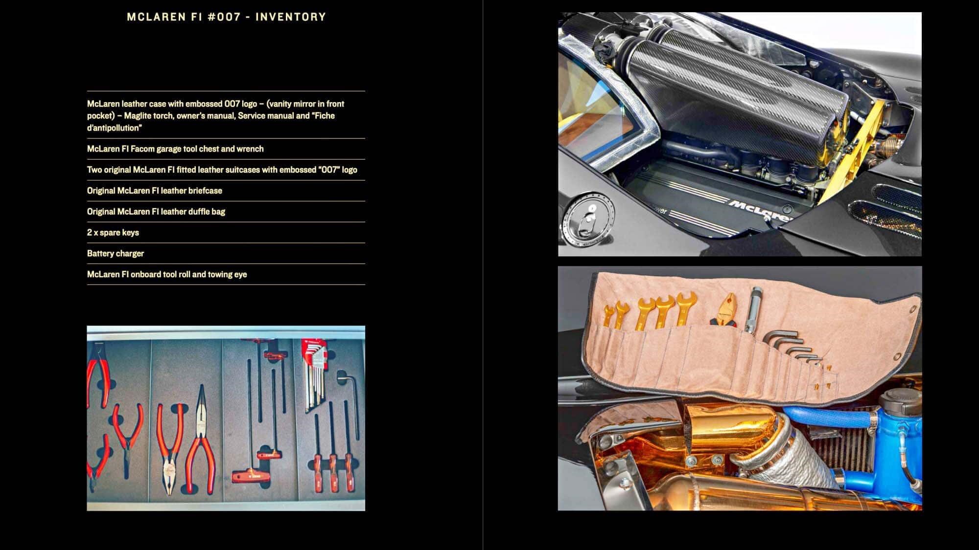 同时,车辆交付时所包含的物品有:编号版F1行李套装、原装Facom工具箱、钛合金随车工具、皮质公文包、旅行软包以及全部保养与使用说明文件。而直到今天,这些物品都完整保留。
