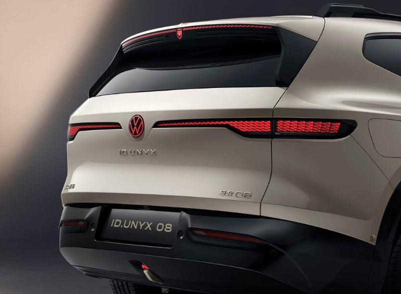 为了符合中大型纯电SUV的产品定位,与众08在设计层面保留了ID. EVO概念车那种凌厉的气质。分体式大灯与贯穿前机盖的锐利LED日行灯相结合,配合机盖上隆起的肌肉线条,让整个前脸像一头蓄势待发的“狼”——这恰好呼应了车尾那个极具辨识度的狼头标高位刹车灯,也算狼堡血统的一次彩蛋式的致敬 。