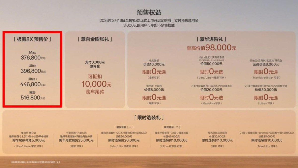 3月16日,极氪汽车正式开启了全新高性能旗舰SUV——极氪8X的预售。在这个已然红海的中大型新能源SUV市场,极氪8X带着37.68万元至51.68万元的预售价区间闯入战场 。对于这个价格,舆论场瞬间分裂:有人惊叹于顶配极氪8X曜影车型突破50万大关的勇气,也有人认为其堆料之猛堪称“价格屠夫”。