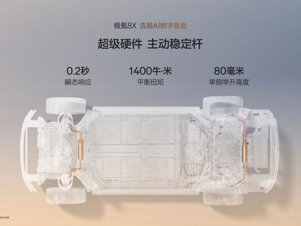 极氪8X搭载了浩瀚AI数字底盘,配备了闭式双腔空气悬架+双阀CCD电磁减振器、48伏主动稳定杆等硬核配置 。这套组合拳保证了车辆在激烈驾驶时的支撑性,也能在颠簸路面带来顶级的滤震表现。其83.6km/h的麋鹿测试成绩,对于一台车长5.1米、车宽近2米的中大型SUV来说,堪称离谱。