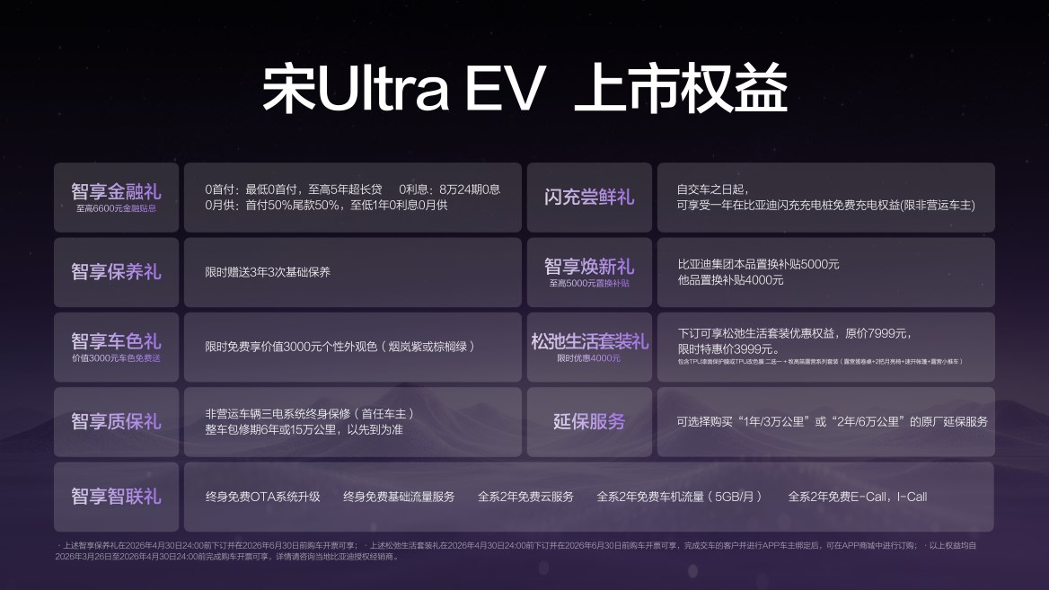 比亚迪王朝正在构建一个从购车、用车、到养车的全链路无忧体系。为此,宋Ultra EV带来了“0元购、0元用、0元养”的超重磅购车权益!同时还有其他丰富权益,为用户带来超值购车体验。