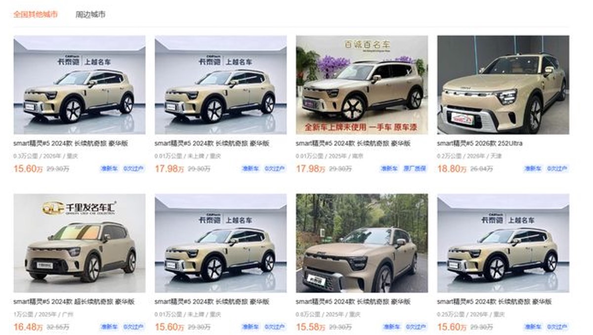 其次,价格策略已经失效。 参考精灵#5的定价区间,预计精灵#6 EHD的起售价可能在19万元左右。而在这个价位,消费者能买到的是技术更领先、配置更丰富的国产新能源车型。更致命的是,Smart的品牌溢价能力正在快速缩水。当大量零公里精灵#5以5.3折的价格在二手车平台甩卖时,消费者对Smart的价格体系已经产生了根本性的不信任。谁会愿意花20多万买一台新车,转头就贬值10万?