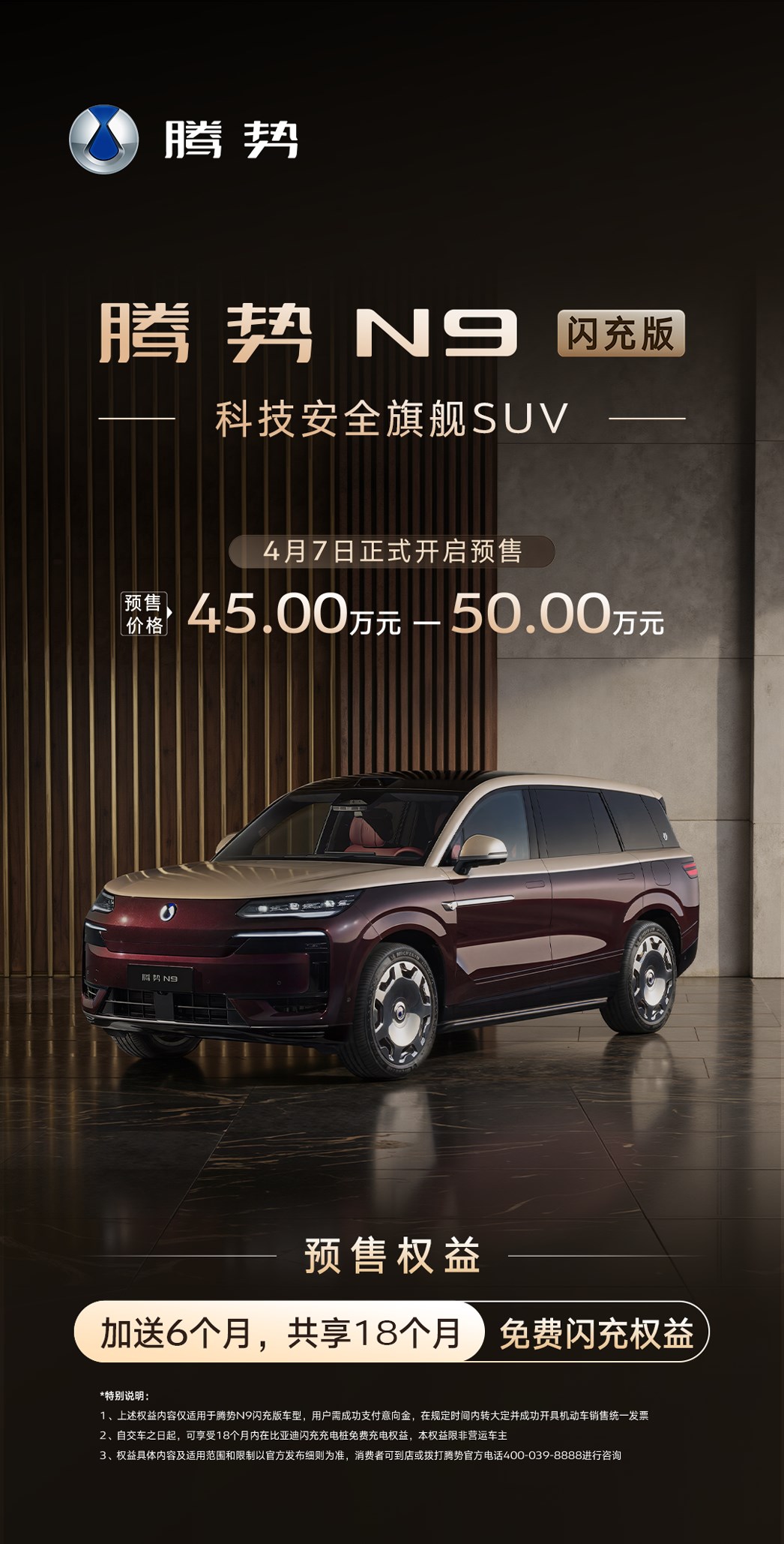 今日,买车网Buycar获悉,腾势N9 闪充版正式开启预售,预售价45万元-50万元。新车标配第二代刀片电池、纯电续航420km,可享受18个月免费闪充权益。