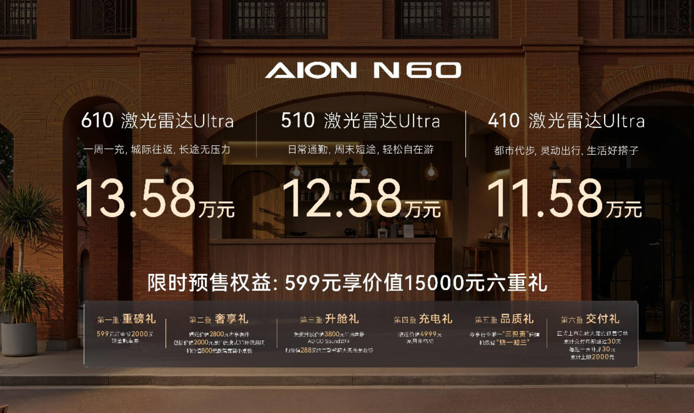 新车共发布三款车型,全系标配激光雷达辅助驾驶、副驾零重力座椅、后五连杆悬架及非晶碳纤维电机配置,预售价11.58万元起,并同步推出了价值15000元的预售权益。